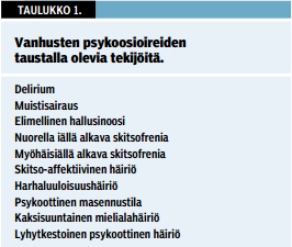 Vanhusten psykoosioireiden diagnosoinnissa käytetään samoja diagnostisia kriteereitä kuin nuoremmilla. Aiempien psykiatristen sairausvaiheiden ja hoitokokemusten selvitys sekä oireiden aiheuttamien toimintakykyyn ja sosiaalisiin suhteisiin kohdentuvien vaikutusten selvitys ovat tärkeä osa tilanteen arviota erityisesti iäkkäillä potilailla. Osaan elimellisistä sairauksista ja lääkehoidoista voi liittyä aistiharhojen ja harhaluulojen ilmaantuminen, joten somaattisen terveydentilan kartoitus on oleellinen osa potilaan tutkimista ja erotusdiagnostiikkaa (taulukko «»1). Sairautta edeltävän persoonallisuuden sekä elämänkokemusten ja kulttuuritaustan kartoitus antavat mahdollisuuden ymmärtää oireistoa paremmin suhteessa potilaan elämänkaareen ja elämäntilanteeseen.