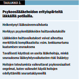 Vanhukset ovat ikääntymiseen ja neurodegeneraatioon liittyvien muutosten vuoksi herkkiä psykoosilääkkeiden neurologisille haittavaikutuksille, ja sekä nopeasti kehittyvät neurologiset oireet että tardiivi dyskinesia ovat heillä tavallisia. Tardiivi dyskinesia on yleisempi niillä iäkkäillä potilailla, joilla on lääkehoidon alussa esiintynyt haittavaikutuksena ekstrapyramidaalioireita (20). Ikääntyvillä skitsofreniapotilailla kardiometaboliset riskitekijät ovat myös tavallisia, joten psykoosilääkehoidon riittävästä seurannasta tulee huolehtia (20).