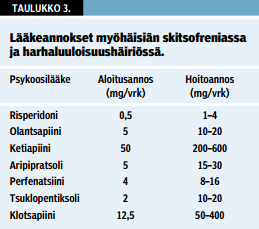 Vanhenemiseen liittyvien farmakokineettisten ja -dynaamisten vaikutusten vuoksi vanhemmille potilaille annettavien lääkeannosten tulee olla ainakin kolmanneksen pienempiä kuin keski-ikäisille annettavat, mutta yksilötasolla käytettävien annosten kokoerot potilaiden välillä voivat olla suuria (20,21) (taulukot «»2 ja «»3). Myös iäkkäillä potilailla esiintyvän usein puutteellisen sairaudentunnon takia paremmin siedetyt uudemmat psykoosilääkkeet ovat ensisijaisia näiden potilaiden hoidossa, ja osalla potilaista on perusteltua myös pitkävaikutteisten psykoosilääkeruiskeiden käyttö. Ikääntyneillä skitsofreniapotilailla voi esiintyä myös elämänlaatua heikentävää masennusoireistoa, joka myös voi edellyttää vuorovaikutuskeskeisen hoidon tehostamista sekä masennuslääkitystä psykoosilääkehoidon lisäksi. Vaikka perinteiset neuroleptit saattavat korjata informaation käsittelyhäiriötä joissakin tilanteissa, ne eivät vaikuta suoranaisesti muistitoimintojen häiriöihin. Poikkeuksen tekevät voimakkaasti asetyylikoliinin vaikutusta estävät valmisteet, jotka heikentävät potilaiden muistia ja muita kognitiivisia toimintoja entisestään. Toisen polven psykoosilääkkeiden on todettu jossain määrin parantavan skitsofreniaa sairastavien potilaiden kognitiivisia häiriöitä, joihin vaikuttaminen voisi oleellisesti parantaa potilaiden päivittäistä selviytymistä (9).