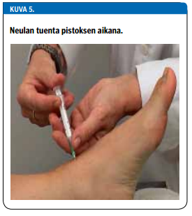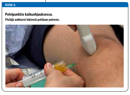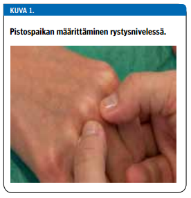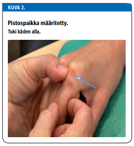 Pistettävä nivel tutkitaan huolellisesti ja pistoskohta määritetään tarkkaan (kuvat 1 «»2 ja 2 «»3).Pistospaikan voi merkitä esimerkiksi tussilla.