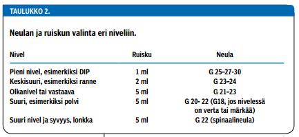 Neulan koko vaihtelee pistettävän nivelen koon sekä sen sijainnin ja syvyyden mukaan (taulukko 2 «»5). Toimenpiteessä käytetään mahdollisimman pientä mutta riittävän isoa neulaa.