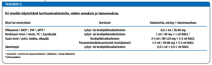 Pistettävän kortisonin ja keittosuolaliuoksen määrää on vaikea arvioida tarkasti etukäteen varsinkin pistettäessä pieniin ja keskisuuriin niveliin. Taulukossa 5 «»10 on suuntaa-antavia ohjeita. Triamsinoloniheksasetonidia ei kuitenkaan tule pistää pieniin niveliin eikä jännetuppiin.