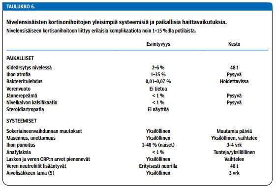 Hyvän hoitovasteen saamiseksi ja turhien haittavaikutusten välttämiseksi on pidettävä mielessä nivelpistosten tavallisimmat vasta-aiheet (taulukko 1 «»1). Mahdolliset vasta-aiheet täytyy aina tarkistaa ja sulkea pois ennen jokaista nivelpistosta, etenkin mahdollinen bakteeritulehdus. On hyvä muistaa, että potilas voi olla allerginen sekä kortisonivalmisteille että ruiskutettavalle puudutteelle. Mahdollisen anafylaktisen reaktion hoitamiseksi paikalle varataan ensiapuvälineet.