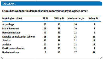 Kaikilla puolisoilla oli kyselyhetkellä ainakin jokin psykologinen oire (taulukko 1 «»1), oireasteikon keskiarvo oli 9,7 (SD 5,8) ja sen sisäinen koherenssi hyvä (α = 0,88). Eniten oli huolestuneisuutta (93 %), jännitystä (76 %) ja epätoivoa tulevaisuuden suhteen (71 %).