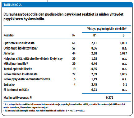 Puolisoista kolmelle neljästä oli aiheutunut tunne-elämän muutoksia. Jos muutoksia ei tullut, psyykkinen hyvinvointi oli parempi; mielialan heittelehtiminen, vihaisuus, katkeruus ja suru yhdistyivät psykologisiin oireisiin. Valtakunnallisessa potilasaineistossamme samoja tunne-elämän muutoksia oli tullut noin puolelle potilaista ja tämä ennakoi heidän psykologisia oireitaan (8). Tunne-elämän muutosten puuttuminen liittyy myös puolisoiden parempaan hyvinvointiin ja voi olla merkki vähäisemmästä tukitoimenpiteiden tarpeesta.