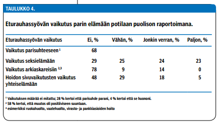 Mitä enemmän sivuvaikutuksia oli tullut, sitä suurempi oli niiden vaikutus yhteiselämään, kuitenkin niin, että lisääntyminen selittyi lähes kokonaan apean tai vaihtelevan mielialan ja ärtyneisyyden lisääntymisellä, ei eturauhasen alueen oireilla (virtsaamisoireet, vaikeudet seksielämässä).