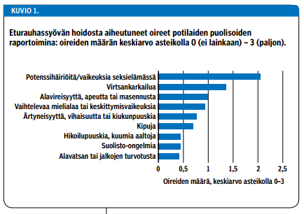 Kaikki eturauhassyövän aktiivihoidot - leikkaus, ulkoinen sädehoito, sisäinen sädehoito (brakyterapia) ja hormonihoito - aiheuttavat valtaosalle potilaista sivuvaikutuksia ja haittoja (5-12). Haitat ovat etenkin virtsatieoireita ja seksielämän ongelmia, hormonihoidossa lisäksi psyykkisiä ja fyysisiä yleisoireita, ja ne heikentävät potilaiden hyvinvointia ja elämänlaatua (13-17). Haittojen esiintymistä Suomessa on kuvattu tässä lehdessä aiemmin (8,11). Seksielämän ongelmia ilmeni 80–93 %:lla potilaista ja seksielämä puolison kanssa oli loppunut hoitojen jälkeen 20–58 %:lta. Kukin hoitomuoto aiheuttaa juuri sille ominaisia haittoja, ja potilaan kokonaiselämäntilanne, mukaan lukien parisuhde, ratkaisee, mikä hoito on juuri hänelle sopivin.