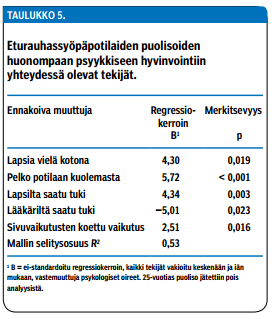 Kun kaikkien kokemusten yhteyttä puolison hyvinvointiin tutkittiin samanaikaisesti, huonompaan psyykkiseen hyvinvointiin olivat yhteydessä se, että perheellä oli lapsia vielä kotona, puoliso pelkäsi miehen kuolevan, lapsilta saatu tuki ja se, että puoliso koki hoitojen sivuvaikutukset voimakkaiksi (taulukko 5 «»6). Sen sijaan puolison kokemus lääkäriltä saadusta tuesta ennakoi puolison parempaa hyvinvointia.