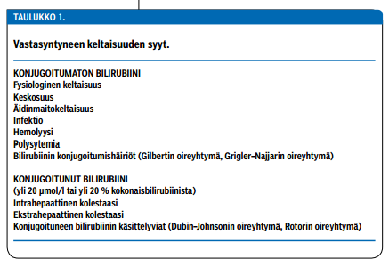 Neonatal jaundice is a common affliction. The treatment for unconjugated neonatal hyperbilirubinaemia is phototherapy. However, when jaundice persists longer than two weeks, conjugated hyperbilirubinaemia must be ruled out. The following criteria should be used to identify patients needing further evaluation: hyperbilirubinaemia lasting > 2 weeks, or high levels of conjugated bilirubin comprising > 20% of total bilirubin, or > 20 µmol/l, and/or acholic (colourless) stools. Such babies should be referred without delay to the nearest paediatric unit, where first line investigations include infection workup, ruling out treatable causes of neonatal cholestasis, and evaluating the child for cholestasis-related malnutrition. Unless a definitive diagnosis can be made and cholestasis resolves quickly, biliary atresia should be ruled out. Biliary atresia (BA) is the leading cause of neonatal jaundice beyond the first few weeks of life. The treatment for BA is surgery, which has best results if performed early (within the first 4-6 weeks of life). In Finland, BA surgery is centralized to Helsinki. Other causes of significant neonatal cholestasis include diseases inducing intrahepatic cholestasis, such as idiopathic neonatal hepatitis, and several different cholestasis syndromes. A cholestatic infant must be provided promptly with specific nutritional support, including fat-soluble vitamin supplementation.