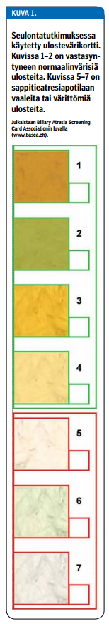 Myös ulosteen väri tulee tarkistaa (kuva 1 «»2). Suolen bakteerit muuntavat bilirubiinin vihreäpigmenttiseksi biliverdiiniksi, joten bilirubiinin värjäämä uloste on keltaista, ruskeaa tai vihreää. Valkoisista, vaalean harmaista tai kitin värisistä (akooliset ulosteet) ulosteista puuttuu bilirubiini, ja tämä viittaa vahvasti kolestaasiin.