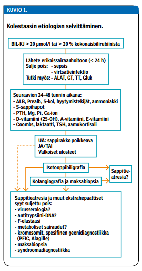 Kolestaattiselta lapselta on tutkittava tulehdusparametrit päivystysluonteisesti, sillä vastasyntyneen infektio (mukaan lukien virtsatieinfektiot) on tavallisimpia neonataalikolestaasin syitä. Muita päivystysluonteisia tutkimuksia ovat maksaentsyymien, hyytymisaktiviteetin ja verensokerin mittaus. Etiologian selvittämistä jatketaan seuraavien vuorokausien aikana (kuvio 1 «»3). Alkuvaiheen tutkimukset on suunnattu niin, että niillä suljetaan pois muut hoidettavissa olevat yleissairaudet kolestaasin aiheuttajina, tunnistetaan vajaaravitsemus ja varmistamaan leikkaushoitoa pikaisesti vaativan sappitieatresian viiveetön diagnostiikka.