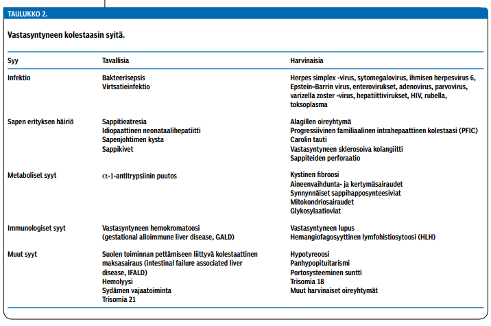 Sappitieatresia on yleisin vastasyntyneen etenevän kolestaasin syy. Sappitieatresian ohella merkittäviä kolestaasin syitä ovat vaikean sepsiksen tai hemolyysin jälkitilat, suonensisäiseen ravitsemukseen ja suolen toiminnan pettämiseen liittyvä kolestaattinen maksasairaus (intestinal failure associated liver disease, IFALD) ja idiopaattinen neonataalihepatiitti (taulukko 2 «»4). Muualla yleinen kystinen fibroosi on Suomessa harvinainen neonataalikolestaasin aiheuttaja.