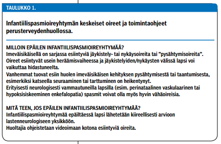 Oirekuvaan kuuluu usein myös kehityksen pysähtyminen tai taantuminen, joka yleensä havaitaan spasmien alkamisen jälkeen, mutta se voi olla myös ensimmäinen huomattu oire (1,3,4). Vanhempien epäily imeväisikäisen lapsen kehityksen taantumisesta tai pysähtymisestä, esimerkiksi katseella seuraamisen tai tarttumisen heikentymisestä, on otettava vakavasti ja lähetettävä lapsi jatkotutkimuksiin (taulukko 1 «»1).
