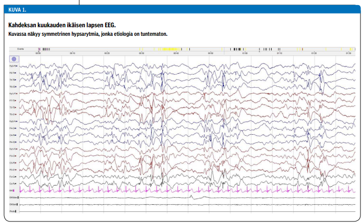 Spasmit dokumentoidaan videoimalla. Usein myös kotona kuvatuista videoista on hyötyä. Uni-EEG-tutkimus tehdään mahdollisimman pian, viimeistään tutkimuksiin tuloa seuraavana arkipäivänä. EEG-tutkimuksessa tyypillinen infantiilispasmeihin liittyvä löydös on hypsarytmia (kuva 1 «»2). Sille tunnusomaista ovat järjestäytymätön hidas taustatoiminta, epäsäännölliset, multifokaaliset, suuriamplitudiset piikit ja terävät aallot. Klassisen hypsarytmian lisäksi infantiilispasmien yhteydessä voi esiintyä erilaisia EEG-poikkeavuuden variaatioita (ns. modifioitu hypsarytmia). Poikkeavuus voi olla asymmetrinen tai tavallista enemmän synkroninen aivopuoliskojen välillä tai se voi olla paikallinen (1,4).