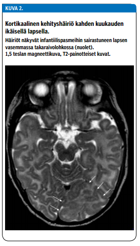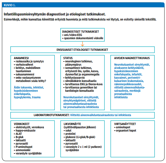 Ensilinjan etiologisiin selvittelyihin kuuluvat huolellinen anamneesi ja kliininen neurologinen tutkimus, joka sisältää arvion lapsen kehitystasosta, sekä aivojen magneettikuvaus. Näiden avulla infantiilispasmien etiologia selviää yli puolella sairastuneista (6). Lisäksi alkututkimuksiin kuuluvat veri-, virtsa- ja likvornäytteet. Ehdotetut alkututkimukset ja mahdollisia syitä infantiilispasmeille on esitetty kuviossa 1 «»3. Jos etiologia ei alkuvaiheen tutkimuksissa selviä eikä vastetta ensisijaishoidoille (ks. alla) saavuteta, edetään harkinnan mukaan geneettisiin ja aineenvaihdunnallisiin jatkotutkimuksiin. Lisäksi aivojen kuvantamisesta 3 teslan magneettilaitteella voi olla hyötyä. Esimerkiksi aivojen kuorikerroksen kehityshäiriöt (kuva 2 «»4) eivät välttämättä tule näkyviin ensimmäisissä kuvissa.