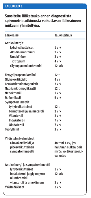Suositeltu lääketauko ennen diagnostista tutkimusta on tavallisen lyhytvaikutteisen sympatomimeetin, kuten salbutamolin käyttäjille 12 tuntia (taulukko 1 «»1). Jos halutaan tutkia tilannetta ilman astman hoidossa käytettyjen yhdistelmävalmisteiden (kortikosteroidi ja pitkävaikutteinen sympatomimeetti) vaikutusta, on lääkityksen oltava tauolla vähintään neljä viikkoa. Jos taas halutaan tutkia tilannetta vain ilman yhdistelmävalmisteen sympatomimeettivaikutusta, on suositeltu tauko tavallisesti 48 tuntia. Keuhkoputkiin vaikuttavien lääkkeiden lääketaukosuositukset on esitetty tarkemmin toisaalla (12).
