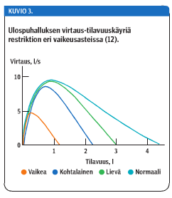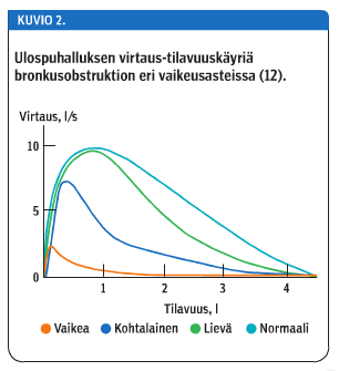 Aluksi arvioidaan spirometriatuloksen luotettavuus. Sen jälkeen tulosta arvioidaan vertaamalla mittaustuloksia viitearvoihin ja tutkimalla käyrien muotoa. Perifeerisessä bronkusobstruktiossa virtaus-tilavuuskäyrän muoto on usein sitä koverampi, mitä vaikeammasta obstruktiosta on kysymys, samalla kun keskimääräiset virtausarvot pienenevät (kuvio 2 «»3). Keuhkojen tilavuuden rajoittumisen (restriktion) vaikeutuessa virtaus-tilavuuskäyrät eivät yleensä ole koveria, vaan käyrien virtaustasot alkavat pienentyä erityisesti ulospuhalluksen loppuvaiheessa virtauksen saavuttaessa nollatason normaalia aikaisemmin, jolloin FVC pienentyy (kuvio 3 «»4).