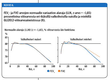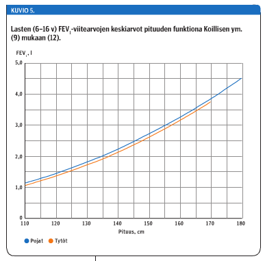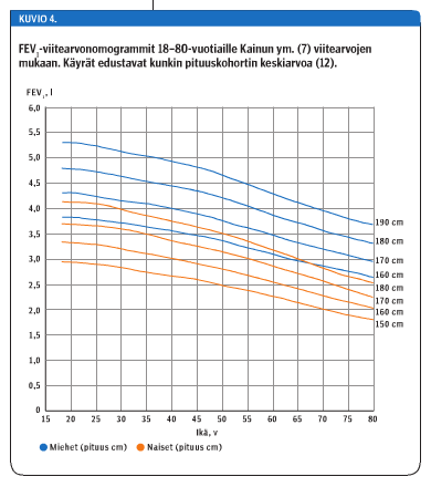 Suomalaisten ja saamelaisten aikuisten spirometriatulosten arvioinnissa suositellaan käytettäväksi Kainun ym. (7) viitearvoja (kuvio 4 «»5) ja syntyperältään muunmaalaisten (aikuisten ja lapsien) tuloksien arvioinnissa monikansallisia GLI2012-viitearvoja (8). Suomalaisten lasten spirometriatulosten arviointiin suositellaan edelleen suomalaisia Koillisen ym. (9) viitearvoja (kuvio 5 «»6).
