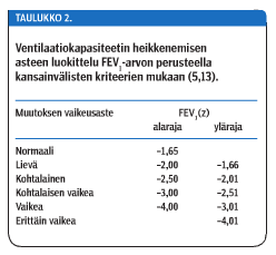 Vaikeusaste määritellään nyt viisiportaisella asteikolla aikaisemman neliportaisen asteikon sijasta (taulukko 2 «»10). Jos FEV1(z)-arvo on -2,0:n ja -1,65:n välillä, ventilaatiokapasiteetin alenema on lievä, ja FEV1(z)-arvon ollessa alle -4,0 ventilaatiokapasiteetti on erittäin vaikeasti laskenut.