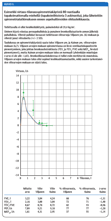 Näiden ongelmien korjaamiseksi on hiljattain julkaistu uudet suomalaiset Kainun ym. (7) spirometrian viitearvot aikuisille. Ne perustuvat 1 000 terveen ja tupakoimattoman 18-84-vuotiaan suomalaisen mittauksiin neljällä eri paikkakunnalla (Helsinki, Kemi, Kuopio ja Tampere). Viljasen ym. viitearvoihin verrattuna ne ovat FVC:n osalta keskimäärin 1 % suuremmat ja FEV1:n osalta 2-3 % pienemmät. Tästä johtuu, että uudet FEV1/FVC:n viitearvot ovat keskimäärin noin 3 % pienemmät kuin vanhat. Erot eivät ole keskimäärin suuria, mutta ne ovat painottuneet nuoriin aikuisiin ja keski-iän ylittäneisiin ikäryhmiin, joissa erot ovat olleet selvästi suuremmat. Viljasen viitearvoissa uloshengitystilavuuden puolivälin ja loppuneljänneksen virtauksien viitearvot (MEF50 ja MEF25) ovat olleet kaikissa ikäryhmissä liian korkeita (7).