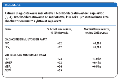 Merkitsevän bronkodilataatiovasteen rajat ovat samat kuin aikaisemmassa suosituksessa (taulukko 3 «»12). FEV1:n ja FVC:n paranemisen raja-arvot, +12 % ja +200 ml lähtöarvosta ovat myös astman diagnostiset raja-arvot bronkodilataatiokokeessa (1,5). Muiden spirometriamuuttujien, kuten PEF:n, MMEF:n ja MEF50:n raja-arvot ylittävä bronkodilataatiovaste on astman suhteen vain viitteellinen, ja usein se antaa aiheen diagnostisiin jatkotutkimuksiin, kuten PEF-vuorokausivaihtelun mittaamiseen tai keuhkoputkien supistumisherkkyyden mittaamiseen histamiini- tai metakoliinialtistuskokeella. On huomattava, että merkitsevä muutos edellyttää sekä suhteellisen että absoluuttisen muutoksen raja-arvon ylittämistä.
