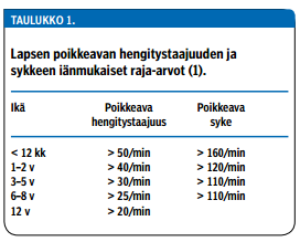 Tärkeimmät alkututkimukset ovat keuhkojen auskultaatio, hengitystaajuuden (taulukko 1 «»1), sykkeen ja happisaturaation (SpO2) mittaus pulssioksimetrillä. Happisaturaation jäädessä alle 90 %:n hengitysvaikeus on vaikea, ja 90-95 %:n taso merkitsee kohtalaista hengitysvaikeutta. Tämän jälkeen potilaalle annetaan happea maskilla tai happiviiksillä ja tavoitellaan normaalia happisaturaatioita (SpO2 yli 95 %). Hengitysteitä avaava lääkitys tulee antaa viipymättä muille paitsi bronkioliittipotilaille, joilla näyttö sen hyödystä on niukkaa. Kun hapensaanti on turvattu, on potilas turvallista siirtää sairaalahoitoon. Kotiutusraja on normaali happisaturaatio ilman lisähappea.