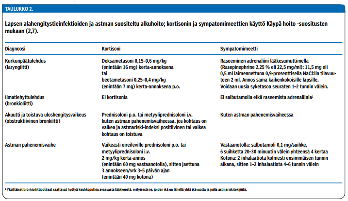 Inhaloitava raseeminen adrenaliini on tehokas laryngiitin oireiden lievittäjä (taulukko 2 «»2). Lisäksi suun kautta tai suoneen annettu glukokortikoidi lievittää oireita tehokkaasti. Mahdollisia lääkevaihtoehtoja ovat deksametasoni 0,15-0,6 mg/kg (enintään 16 mg) tai liuotettavat beetametasonitabletit 0,25-0,4 mg/kg (enintään 7 mg) kerta-annoksena suun kautta (taulukko 2 «»2). Myös sumuttimesta inhaloitava budesonidi (2 mg) voi vähentää oireita niillä lapsilla, jotka ensin ovat saaneet glukokortikoidin suun kautta (2,3). Eri glukokortikoidien välillä ei ole eroja, vaan valinta perustuu lasta vähiten rasittavaan vaihtoehtoon.