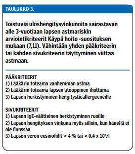 Raja obstruktiivisen bronkiitin ja astman (J45.0, J45.1, J45.9) välillä on liukuva (7). Suurella osalla ei-allergisista lapsista kyse on väistyvästä taipumuksesta, joka johtuu pienten keuhkoputkien ahtaudesta virusinfektion yhteydessä (7). Toisaalta herkistyminen siite- tai eläinpölyille on merkittävä astman riskitekijä ja voi aiheuttaa oireilun jatkumisen kouluikään (8,9,10).