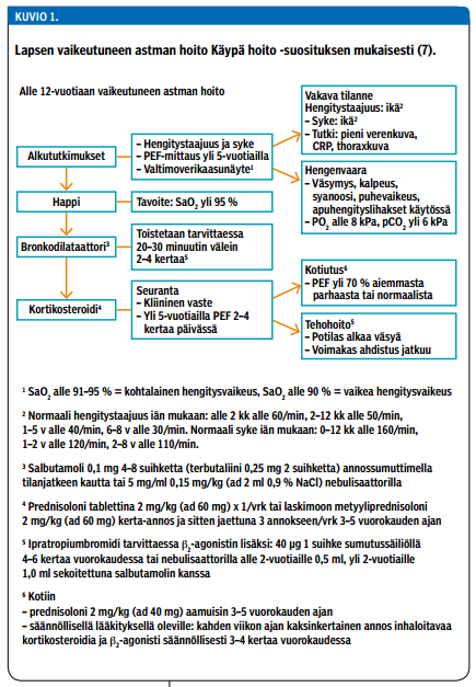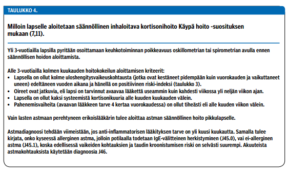 Useimmiten astman paheneminen on lievää ja hoidoksi riittää keuhkoputkia avaavan lääkityksen antaminen viipymättä ja inhaloitavan kortikosteroidin annoksen suurentaminen (taulukko 2 «»2 ja kuvio 1 «»5) (7,8,9,10). Lisäksi on kiinnitettävä huomioita astman pitkäaikaishoidon laatuun: onko potilaalla asianmukainen seuranta omalla astmalääkärillä, onko hengitystieallergiat selvitetty, ottaako lapsi lääkkeensä ja ottaako hän ne oikein, onko annos riittävä ja onko potilaalla kirjalliset omahoito-ohjeet? Tavoitteena on oireiden hallinta ja pahenemisvaiheiden esto. Ohjeita säännöllisen lääkehoidon aloittamiseen on taulukoissa 3 ja 4. Akuutin astman kotihoito-ohje on artikkelin sähköisen version liitteenä (Liite 3).