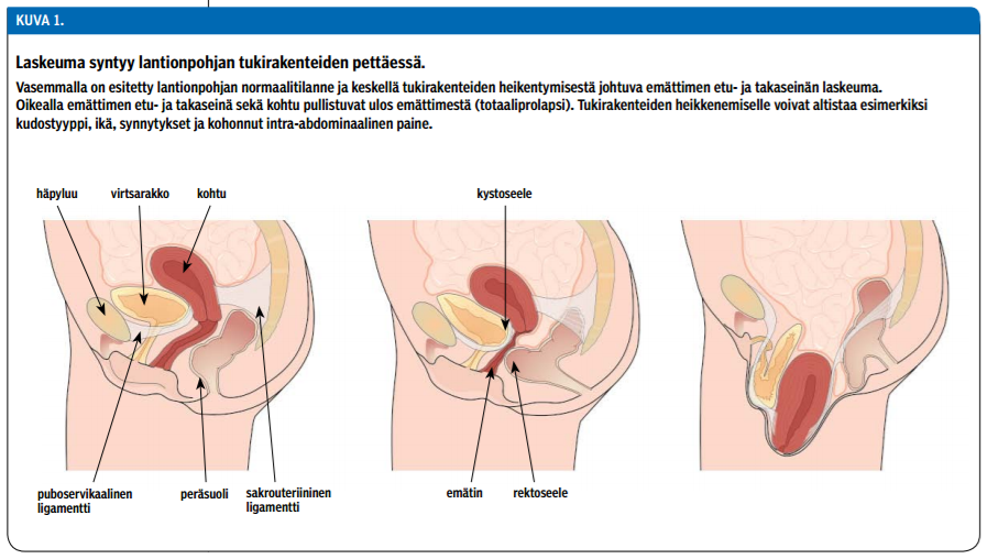 Lantionpohjan tukirakenteet ja pikkulantiossa sijaitsevat elimet muodostavat varsin monimutkaisen toiminnallisen kokonaisuuden. Teoreettisen perustan laskeumakirurgian onnistumiselle antaa DeLanceyn luoma malli lantionpohjan ja emättimen tuen kolmesta eri tasosta (28). Sen mukaan emättimen pohjan keskeisiä tukirakenteita ovat sakrouteriiniset ja kardinaaliligamentit.