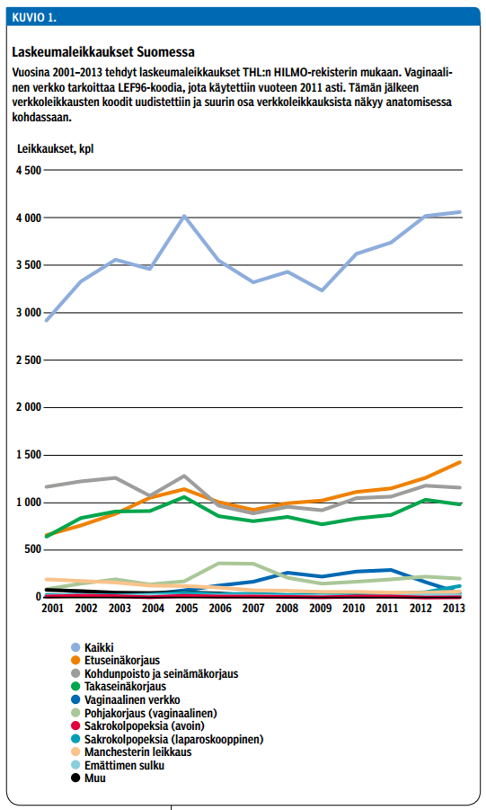 Suomessa on viime vuosina tehty nelisen tuhatta gynekologista laskeumaleikkausta vuosittain (kuvio 1 «»3). Laskeumakirurgia on tyypillisesti vaihdevuodet ohittaneiden naisten kirurgiaa, ilmaantuvuus on suurinta 70-79-vuotiailla naisilla. Leikkausten tarve tulee lähivuosina kasvamaan ikääntyneen väestön määrän lisääntyessä. Laskeumakirurgiaan liittyy monia ongelmia, joista keskeisiä ovat riittämätön tieto eri leikkausmenetelmien tuloksista ja suuri uusintaleikkausten tarve (taulukko 1 «»4).