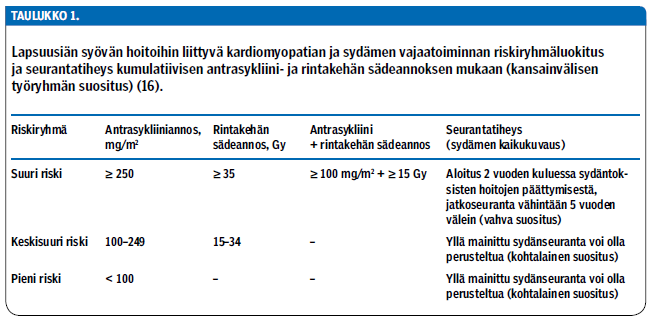 Syövän hoitojen perusteella on laadittu sydämen vajaatoiminnan riskiryhmäluokitus (taulukko 1 «»1). Suuren riskin ryhmään kuuluville suositellaan elinikäistä sydänseurantaa vähintään viiden vuoden välein, ja seuranta tulisi aloittaa kahden vuoden kuluessa sydäntoksisten hoitojen päättymisestä (16). Geneettisesti alttiit saattavat saada sydänhaittavaikutuksia jo pienempiä annoksia käytettäessä (17), joten myös keskisuuren ja pienen riskin ryhmissä sydänseuranta on aiheellinen ainakin lapsuudessa.