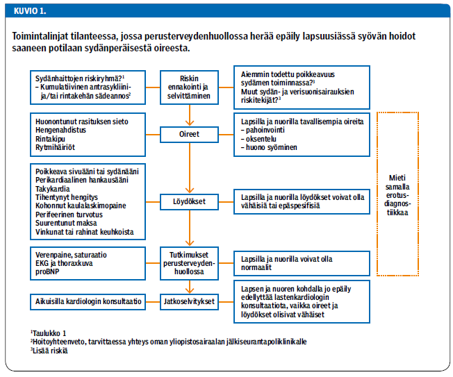 Kun perusterveydenhuollossa havaitaan lapsena syövän sairastaneella sydän- tai verisuonisairauteen viittaavia oireita ja löydöksiä, on käynnistettävä tutkimukset, vaikka potilas olisi nuori (kuvio 1 «»2). Lapsipotilas lähetetään lastenkardiologin konsultaatioon, vaikka löydökset olisivatkin vähäiset, ja myös aikuisista on syytä herkästi konsultoida kardiologia. Lisätutkimukset tehdään kardiologin arvion mukaan. Sydämen supistuvuutta arvioidaan kaikukuvauksella. Rasituskoetta voidaan myös tarvita, ja hengitys- ja verenkiertoelimistön toimintakykyä voidaan arvioida spiroergometrialla.