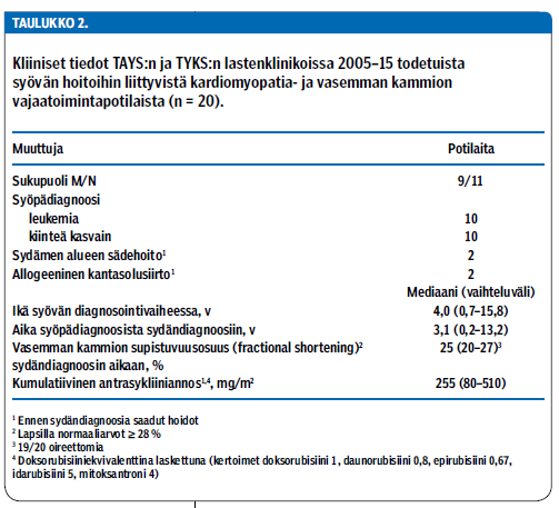 Syöpädiagnoosin jälkeinen vasemman kammion vajaatoiminta todettiin 20 lapsella (taulukko 2 «»3). Näistä 9 todettiin vuoden kuluessa antrasykliinihoidosta (varhainen), 9 yli vuoden kuluttua antrasykliinihoidon loppumisesta (myöhäinen) ja 2 vuosien jälkeen ilmaantuneen relapsin tai toisen syövän aikana. Vajaatoimintapotilaista 11 kuului hoitojensa sydäntoksisuuden perusteella suuren riskin, 8 keskisuuren riskin ja 1 pienen riskin ryhmään.