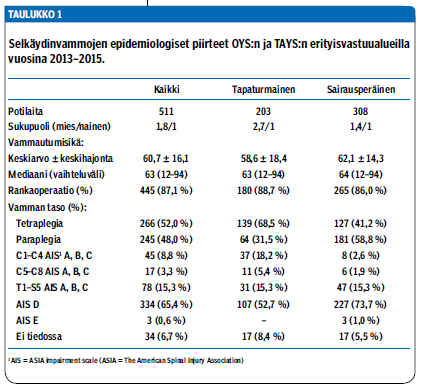 Vuosina 2013-2015 vammautuneiden, OYS:n ja TAYS:n erva-alueilla asuvien selkäydinvammapotilaiden keski-ikä oli 60,7 vuotta. Miehiä heistä oli 64,3 %. Kaikista potilaista 52,0 %:lla oli tetraplegia, ja vamma luokiteltiin täydelliseksi (AIS A) 9,2 %:lla (taulukko 1 «»1).