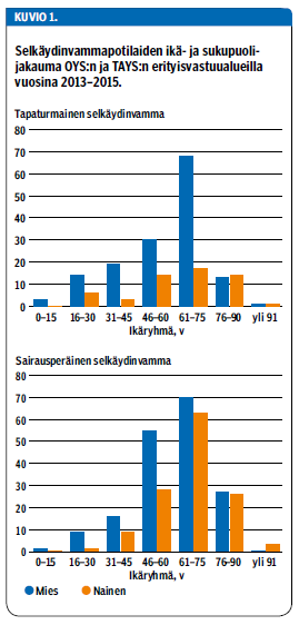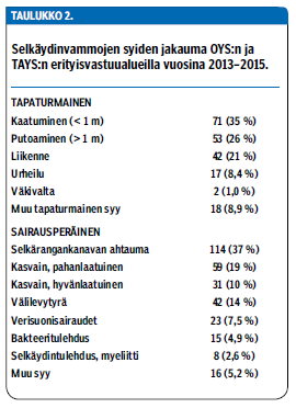 OYS:ssa ja TAYS:ssa hoidettiin vuosina 2013-2015 yhteensä 586 vastavammautunutta selkäydinvammapotilasta. OYS:n ja TAYS:n erva-alueiden asukkaita potilaista oli 511, ja heidän selkäydinvaurioista oli sairausperäisiä 308 (60,3 %) ja tapaturmaisia 203 (39,7 %). Potilaista 75 oli TYKS:n tai KYS:n erva-alueiden asukkaita (liitetaulukko 1, www.laakarilehti.fi > Sisällysluettelot > SLL 39/2017 «http://www.laakarilehti.fi/pdf/2017/SLL392017-2160.pdf»2)).
