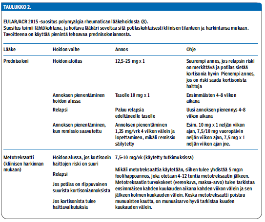 On myös muistettava, että metotreksaatti poistuu munuaisten kautta ja munuaistoiminta voi olla heikentynyt iäkkäillä potilailla. Niinpä polymyalgia rheumatican hoito glukokortikoideilla ilman metotreksaattia on edelleen käypää hoitoa.