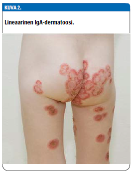 Lineaarinen IgA-dermatoosi on lapsillakin tavattava, ihon rakkulointia aiheuttava pemfigoidi-ryhmän sairaus, jossa punoitus ja rakkulointi esiintyvät rengasmaisina muodostelmina (1) (kuva 2 «»3).