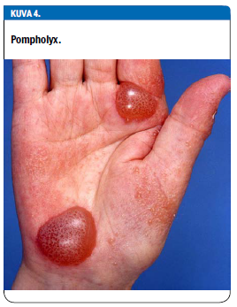 Pompholyx eli dyshidroosi on ekseeman muoto, jossa esiintyy kirkkaita, usein pieniä nesterakkuloita kämmenissä tai jalkapohjissa. Toisinaan rakkulat voivat laajentua jopa 1-2 cm:n kokoisiksi bulliksi (kuva 4 «»5).