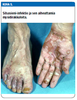 Osalle potilaista kehittyy immunologisella mekanismilla jalkasilsan yhteydessä kirkkaita, steriilejä rakkuloita käsiin. Tällöin puhutaan id-reaktiosta tai mysideistä (kuva 5 «»6). Näitä rakkuloita voi olla vaikea kliinisesti erottaa pompholyx-rakkuloista, joten käsi-ihottumapotilaan jalatkin kannattaa tutkia. Varvasvälien silsa jää usein potilaalta huomaamatta, joten jalat on syytä tutkia, vaikkei niissä potilaan mukaan olisi iho-ongelmia. Sieni-infektio varmistetaan nopeimmin ihon pintanäytteen dermatofyyttien nukleiinihappo-osoituksella (Dermatofyytti-NhO). Näytteenottotekniikka on samanlainen kuin sieniviljelynäytettä otettaessa (14).