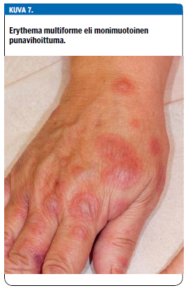 Herpes-virus tai muu infektio (esimerkiksi mycoplasma pneumoniae) voi laukaista immunologisella mekanismilla erythema multiformen eli monimuotoisen punavihoittuman. Sille ovat tyypillisiä ihon ns. kokardileesiot eli vaaleaa, harmahtavaa keskustaa ympäröivä tummanpuhuva rengasmainen punoitus. Sen ympärillä saattaa vielä olla vaaleampi punoittava vyöhyke. Kuolioitunut epidermis kokardileesion keskellä voi muodostaa myös rakkulan (kuva 7 «»8).