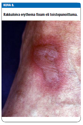 Erythema fixum on lääkkeen laukaisema iho-oire, jossa potilaalla on usein yksittäinen pyöreä tai soikea, tarkkarajainen, usein violetinpunainen läiskä, jonka keskusta voi nousta rakkulalle (kuva 8 «»9). Akuutin vaiheen jälkeen iholle jää tummentunut hyperpigmentaatio pitkäksi aikaa.