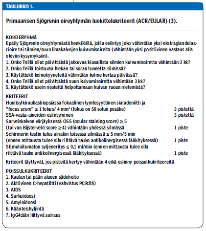 European League Against Rheumatism (EULAR) ja American College of Rheumatology (ACR) ovat vastikään julkaisseet oireyhtymälle uudet luokittelukriteerit (3) (taulukko 1 «»1).