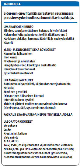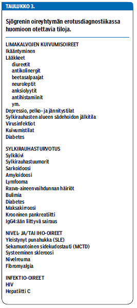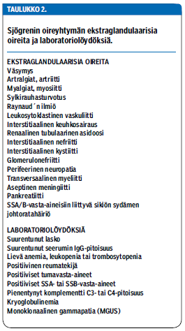 Epäily Sjögrenin oireyhtymästä herää yleensä joko limakalvojen kuivumisen, ekstraglandulaarisen (avoeritteisten rauhasten ulkopuolisen) ilmentymän tai laboratoriolöydöksen perusteella (taulukko 2 «»2).