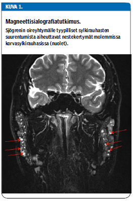 Sjögrenin oireyhtymän tunnusomaiset oireet, silmien ja suun kuivuminen, aiheutuvat kyynel- ja sylkirauhasten lymfosyyttivaltaisesta tulehduksesta ja toiminnan häiriöstä. Primaarinen Sjögrenin oireyhtymä esiintyy itsenäisenä. Sekundaarinen tautimuoto liittyy muihin autoimmuunisairauksiin kuten nivelreumaan, yleistyneeseen punahukkaan (SLE) tai systeemiseen skleroosiin (1). Jopa kolmasosalla nivelreumaa sairastavista voi esiintyä sekundaarisen Sjögrenin oireyhtymän oireita.