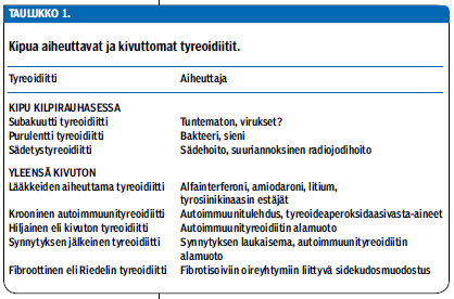 Subakuutti tyreoidiitti tulisi tunnistaa kilpirauhasen kivun syyksi selvästi sairaalla potilaalla, jolla todetaan myös suurentuneet tulehdusarvot ja hypertyreoosi. Muut kipua aiheuttavat tyreoidiitit ovat harvinaisia.