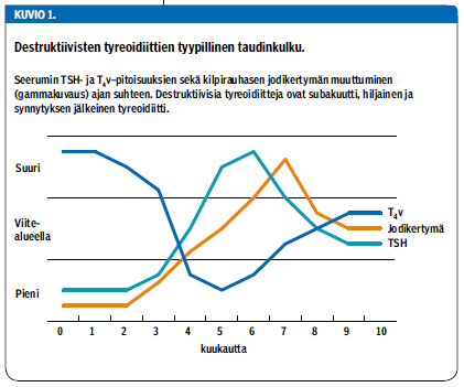 Synnytyksen jälkeisenä pidetään naisella vuoden kuluessa synnytyksestä todettavaa tyreoidiittia, johon kuuluu destruktiiviselle tyreoidiitille tyypillinen asteittainen kilpirauhasen toiminnanhäiriö (kuvio 1 «»2). Sairaus voi ilmetä myös pelkkänä ohimenevänä hyper- tai hypotyreoosina. Esiintyvyys on noin 7-8 %, mutta selvästi suurempi, jopa 25 %, naisilla, joilla on tyypin 1 diabetes. Aiemmin sairastettu synnytyksen jälkeinen tyreoidiitti ja tyreoideaperoksidaasivasta-aineet lisäävät sairauden todennäköisyyttä (19).