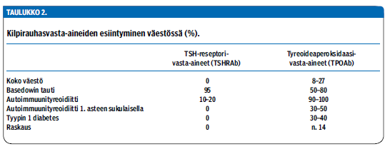 Kun synnyttäneellä naisella todetaan tyreotoksikoosi, erotusdiagnostiikassa voivat tyreoideaperoksidaasivasta-aineiden lisäksi auttaa TSH-reseptorivasta-aineet (TSHRAb). Basedowin taudin hypertyreoosissa TSHRAb-pitoisuus on aina suurentunut, mutta autoimmuunityreoidiiteissa harvemmin (taulukko 2 «»3). Lisäksi Basedowin taudissa seerumin trijodityroniinin pitoisuus (S-T3v) kasvaa yleensä suhteessa enemmän kuin tyroksiinin (S-T4v), ja hypertyreoosi jatkuu pidempään kuin synnytyksen jälkeisessä tyreoidiitissa.