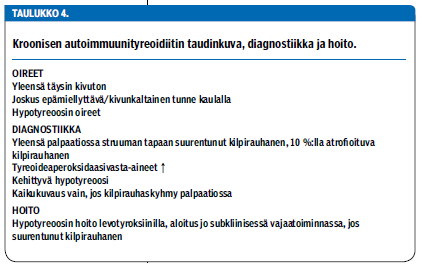 Krooninen autoimmuunityreoidiitti (taulukko 4 «»5) on maailmanlaajuisesti yleisin hypotyreoosin syy alueilla, joilla ei ole jodinpuutosta. Sen etiologiaa pidetään geneettisen alttiuden ja ympäristötekijöiden yhdistelmänä. Patogeneesiä ja välittäjäaineita on tutkittu lisää viime vuosina.