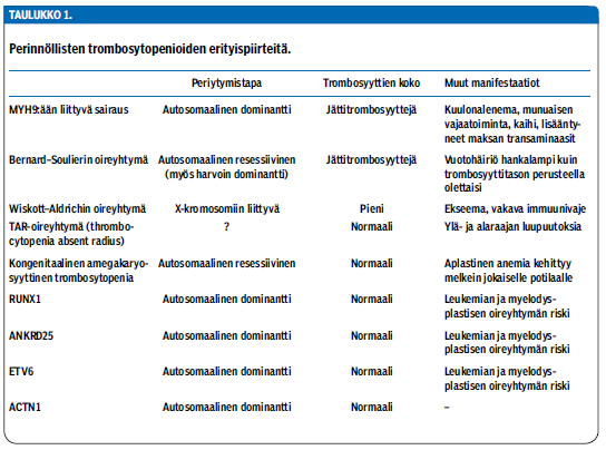 Perinnöllinen trombosytopenia on harvinainen, ja sen aiheuttajamutaatioiden joukko on varsin laaja. Joskus trombosyyttien koko, dysmorfiset piirteet, muut elinmanifestaatiot ja periytymistapa johtavat oikean diagnoosin jäljille (taulukko 1 «»1), mutta usein eteenpäin päästään vain geenipaneelitutkimuksilla. Nykyisin tunnetaan ainakin 22 perinnöllisen trombosytopenian geenitausta (13), mutta edelleen noin puolet ilmeistä perinnöllistä trombosytopeniaa sairastavista jää ilman geneettistä diagnoosia. Toisaalta vaikuttaa siltä, että hankalimmat hoitoa tai seurantaa vaativat geenimutaatiot sisältyvät valtaosin jo nyt käytössä oleviin geenipaneeleihin.
